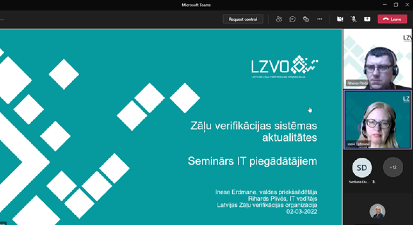 LZVO IT vadītājs Rihards Plivčs informēja partnerus par Eiropas verifikācijas sistēmas plānoto turpmāko attīstību, par sagaidāmajām Latvijas verifikācijas sistēmas jaunajām relīzēm, to testiem un nepieciešamību visiem lietotājiem pāriet uz interfeisa versijām v4 un v5, kā arī par topošo trauksmes paziņojumu vadības sistēmu AMS (Alert Management System). Partneri saņēma arī pilnu atgādinājuma informāciju par kontaktiem un saziņu ar LZVO un Arvato ārkārtas situācijās.